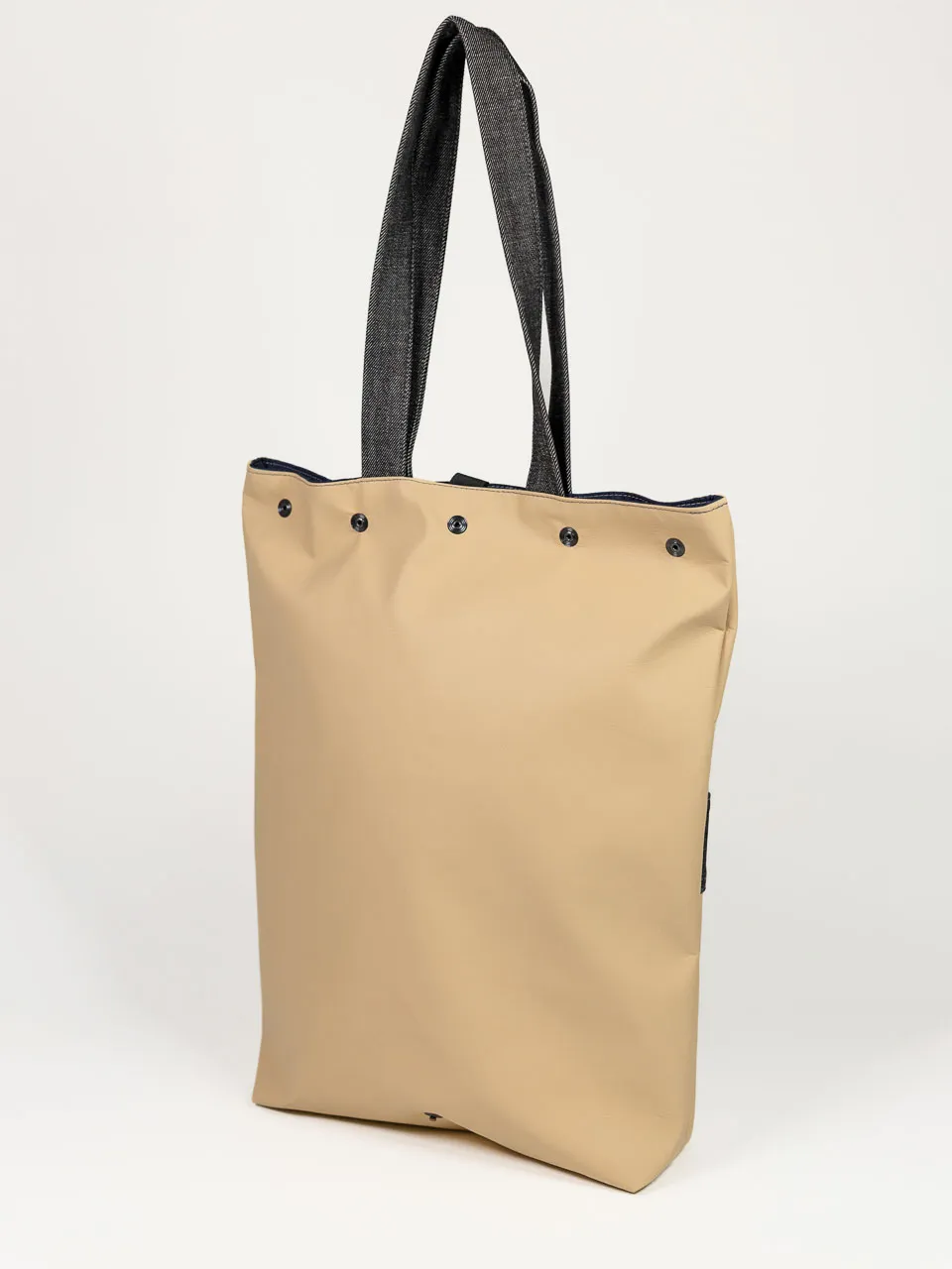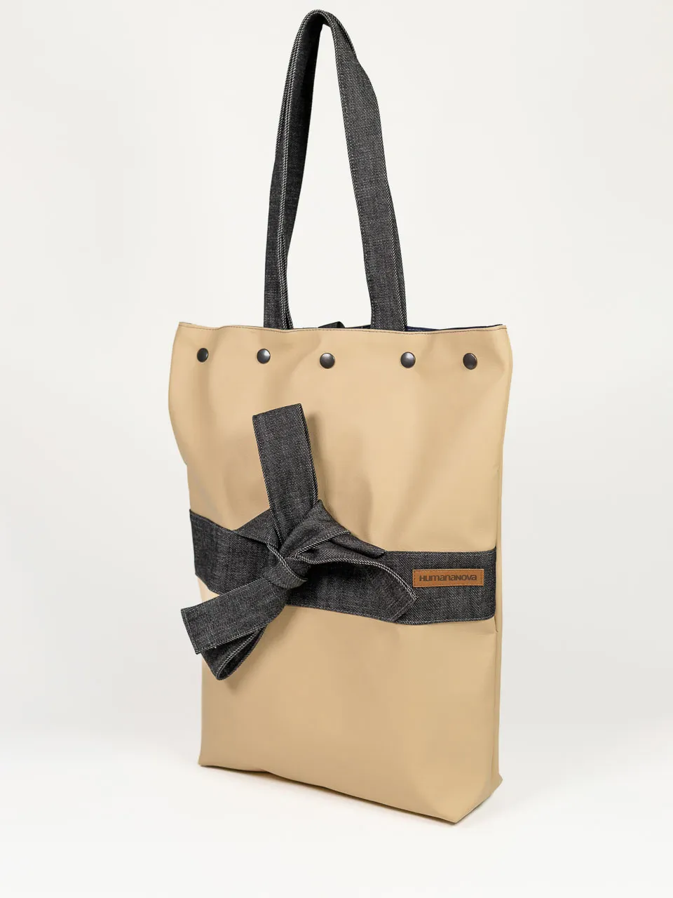 Bike torba izrađena je od eko kože i kombinacije ostalih materijala. Sastoji se od ručaka za nošenje u jednoj ruci te od vezica pomoću kojih je torbu moguće zavezati na volan bicikla.