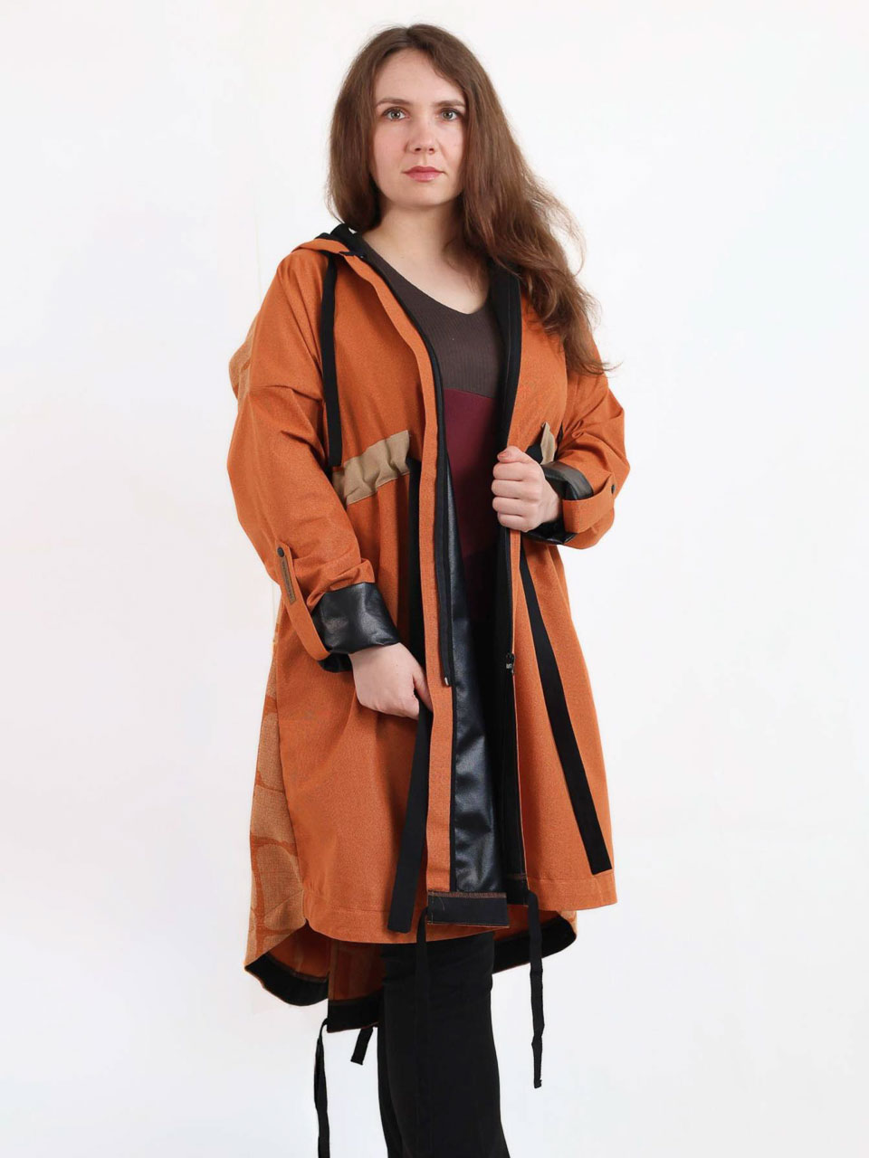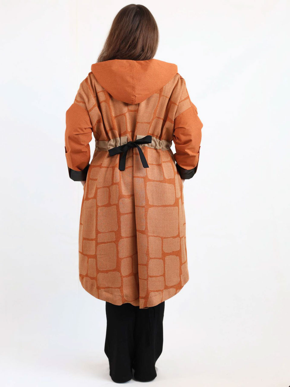 The parka is made from a combination of repurposed materials and leftover fabrics from the cutting process, making each piece unique. It comes in two sizes, with a cut that easily adapts to different body shapes. It features a zipper and waist-adjusting drawstrings, while straps on the front and back allow you to shape the folds as desired. Functional, comfortable, and sustainable – ideal for those who want to wear responsible fashion with character. Size range: XS-M