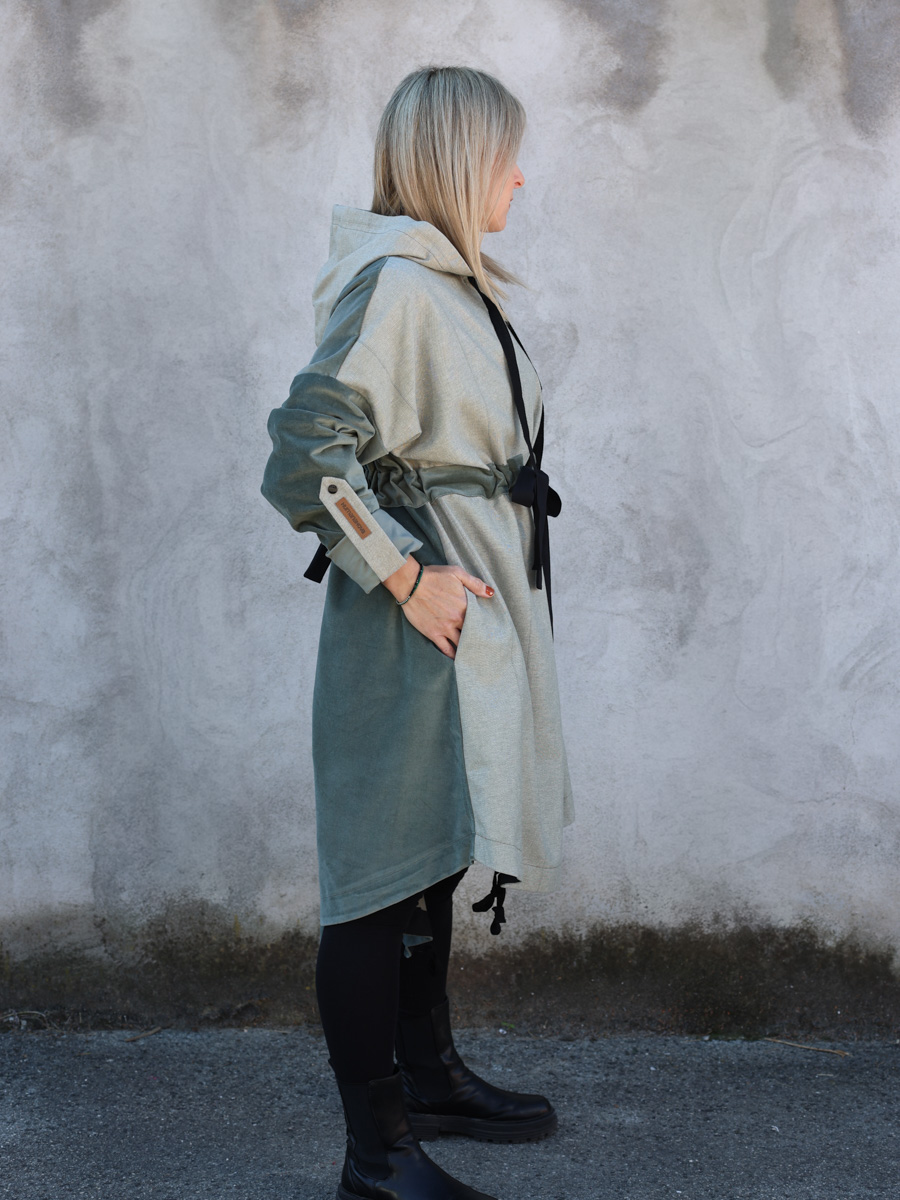 Parka je izrađena je od kombinacije prenamijenjenih materijala i ostataka iz procesa krojenja, što svaku čini unikatnom. Dolazi u dvije veličine, s krojem koji se lako prilagođava različitim oblicima tijela. Parka ima zatvarač i vezice za podešavanje u struku, a pomoću trakica s prednje i stražnje strane moguće je oblikovati nabor prema želji. Funkcionalna, udobna i održiva – idealna za sve koji žele nositi odgovornu modu s karakterom.