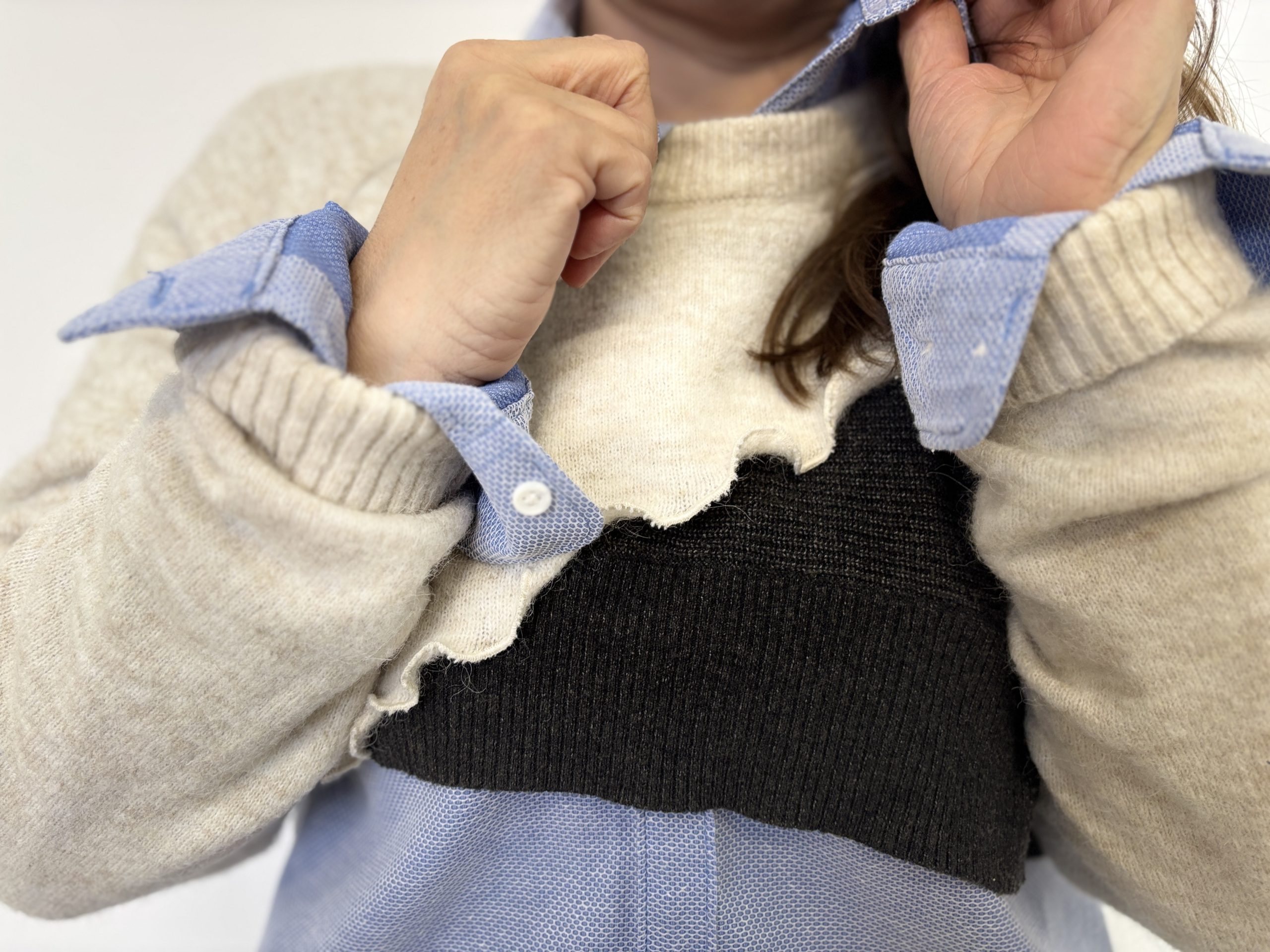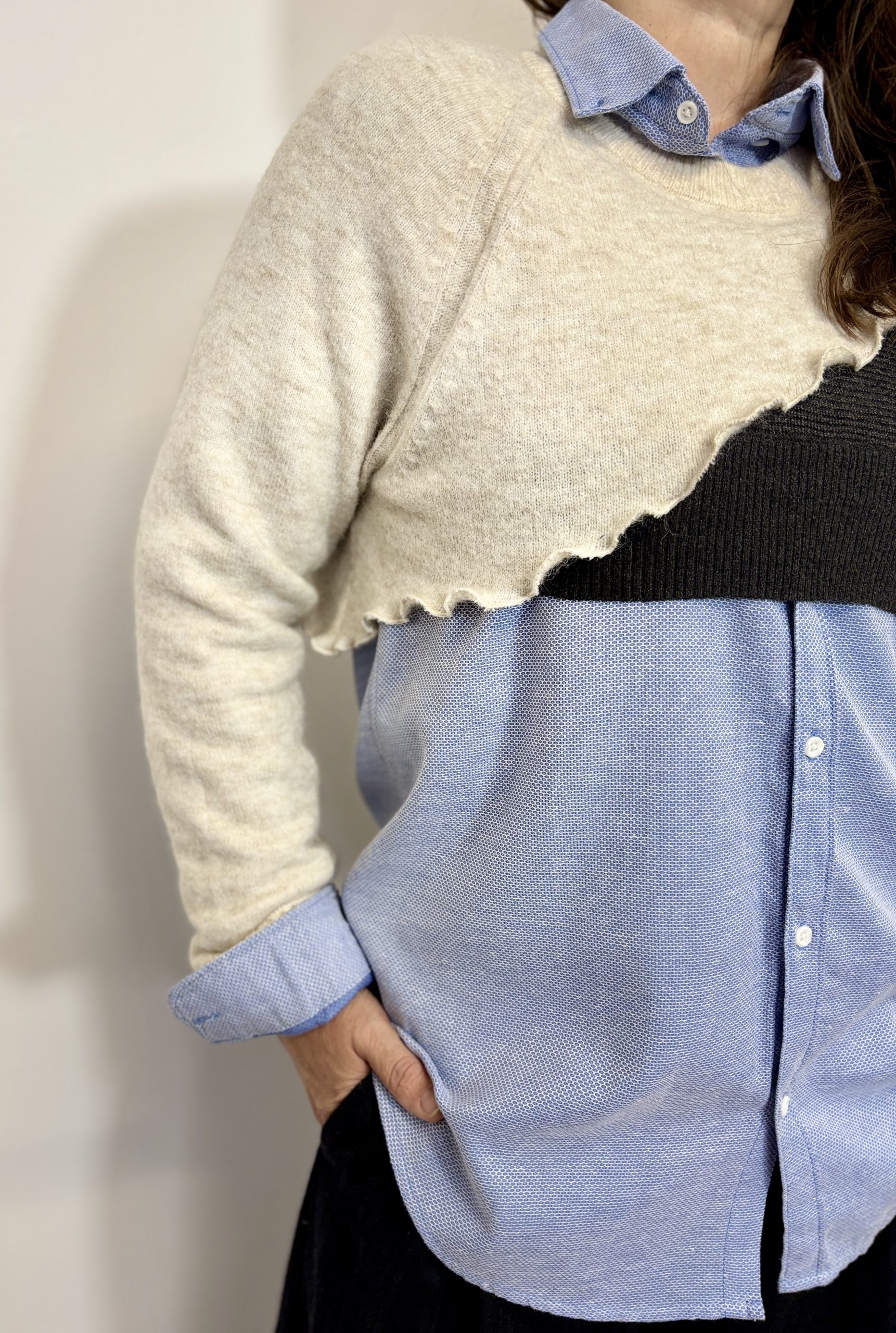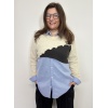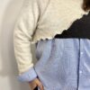 Košulja je nastala procesom upcyclinga postojeće muške košulje koja je nekome bila višak, s dodatkom unikatnog bolera. Može se nositi i bez bolera. Veličina: 36-40