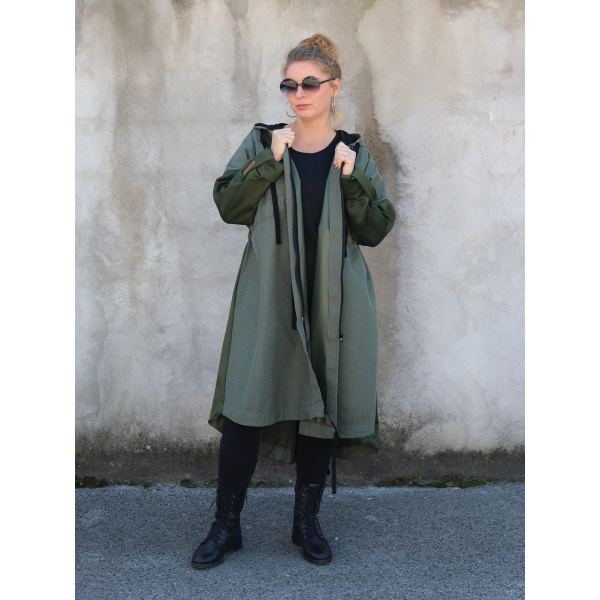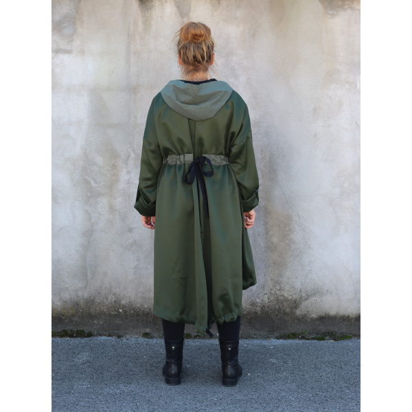 Dolazi u dvije veličine, s krojem koji se lako prilagođava različitim oblicima tijela. Parka ima zatvarač i vezice za podešavanje u struku, a pomoću trakica s prednje i stražnje strane moguće je oblikovati nabor prema želji. Funkcionalna, udobna i održiva – idealna za sve koji žele nositi odgovornu modu s karakterom.