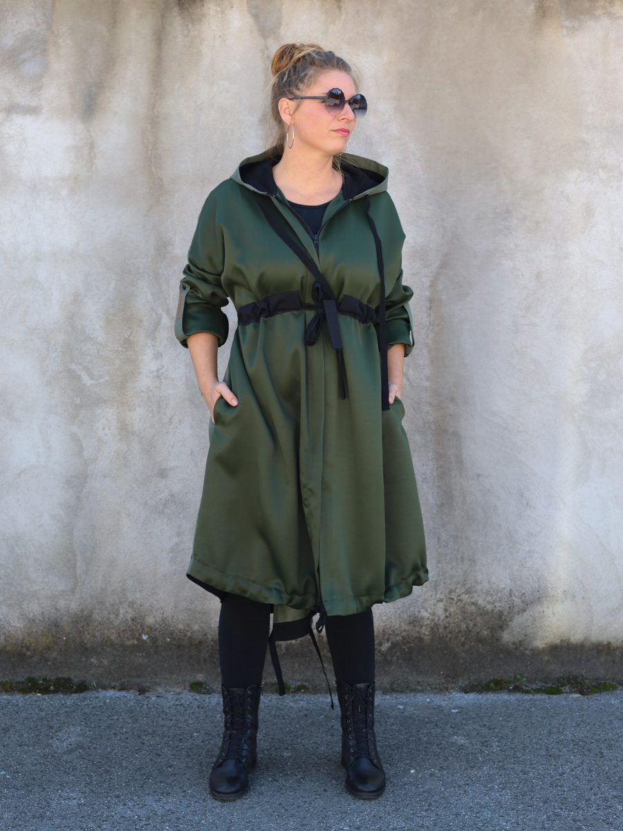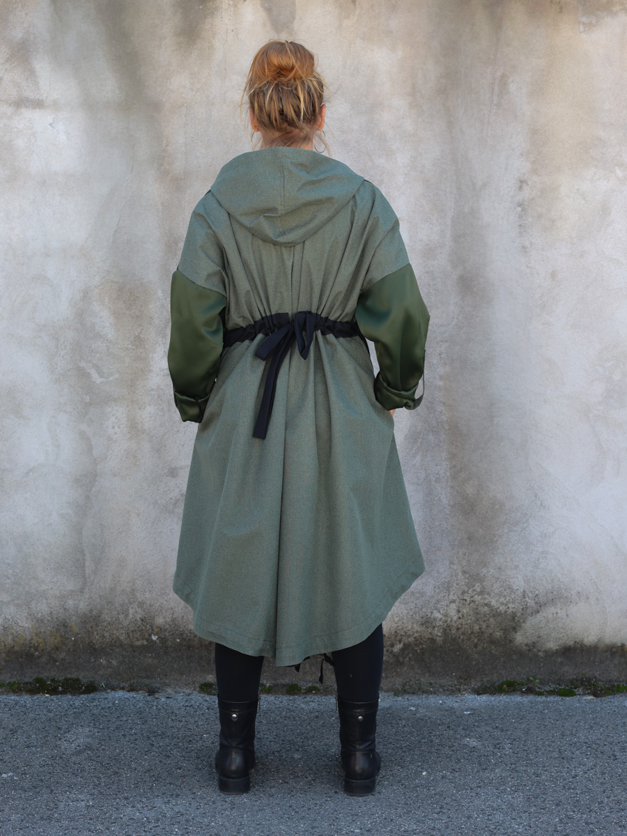 Dolazi u dvije veličine, s krojem koji se lako prilagođava različitim oblicima tijela. Parka ima zatvarač i vezice za podešavanje u struku, a pomoću trakica s prednje i stražnje strane moguće je oblikovati nabor prema želji. Funkcionalna, udobna i održiva – idealna za sve koji žele nositi odgovornu modu s karakterom.