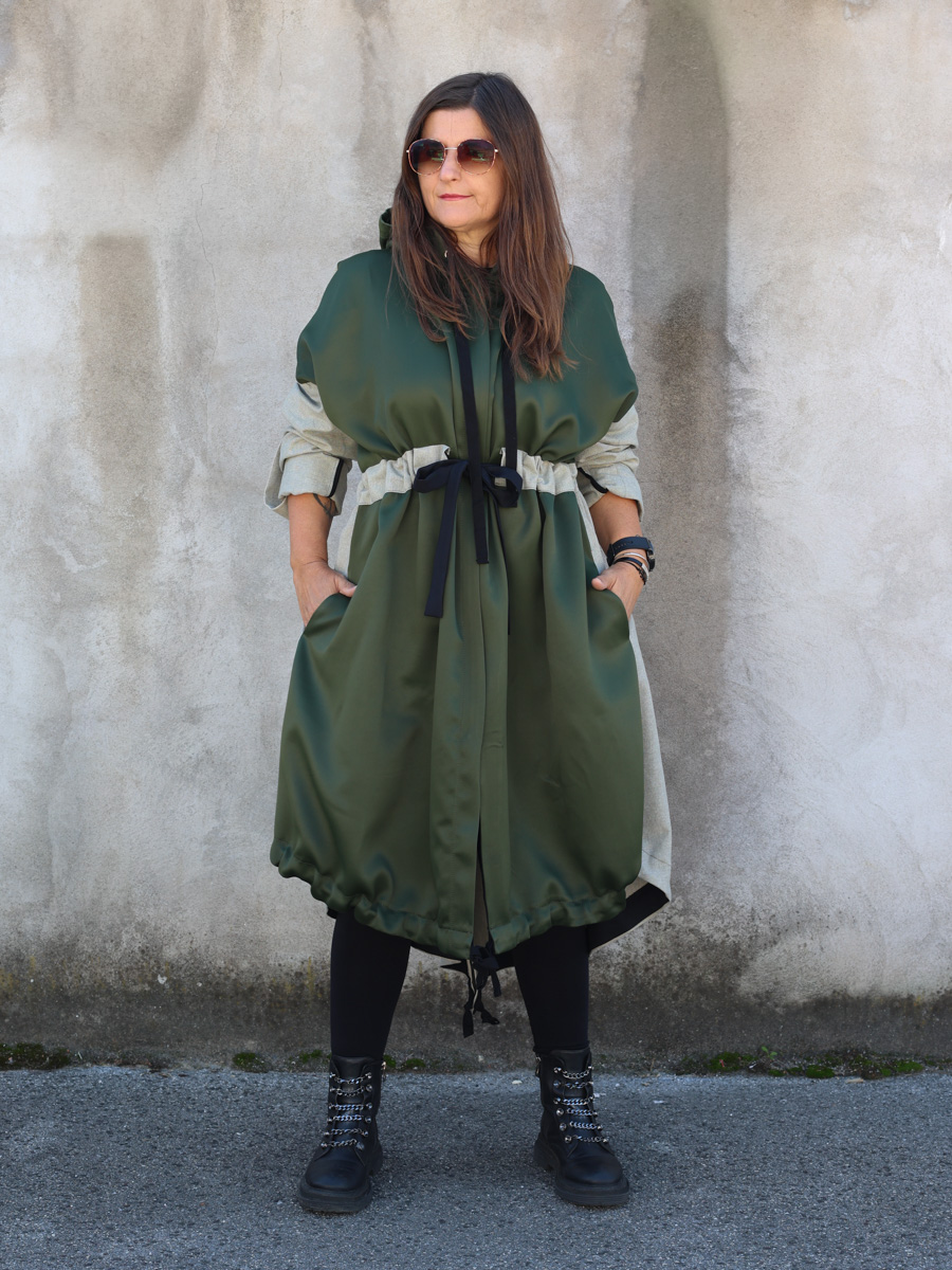 Dolazi u dvije veličine, s krojem koji se lako prilagođava različitim oblicima tijela. Parka ima zatvarač i vezice za podešavanje u struku, a pomoću trakica s prednje i stražnje strane moguće je oblikovati nabor prema želji. Funkcionalna, udobna i održiva – idealna za sve koji žele nositi odgovornu modu s karakterom.