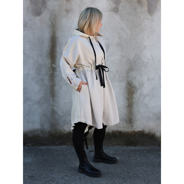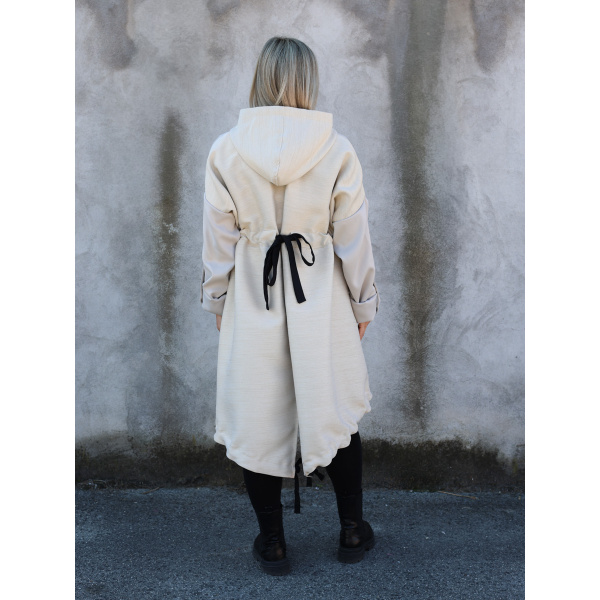 Parka je izrađena je od kombinacije prenamijenjenih materijala i ostataka iz procesa krojenja, što svaku čini unikatnom. Dolazi u dvije veličine, s krojem koji se lako prilagođava različitim oblicima tijela. Parka ima zatvarač i vezice za podešavanje u struku, a pomoću trakica s prednje i stražnje strane moguće je oblikovati nabor prema želji. Funkcionalna, udobna i održiva – idealna za sve koji žele nositi odgovornu modu s karakterom.