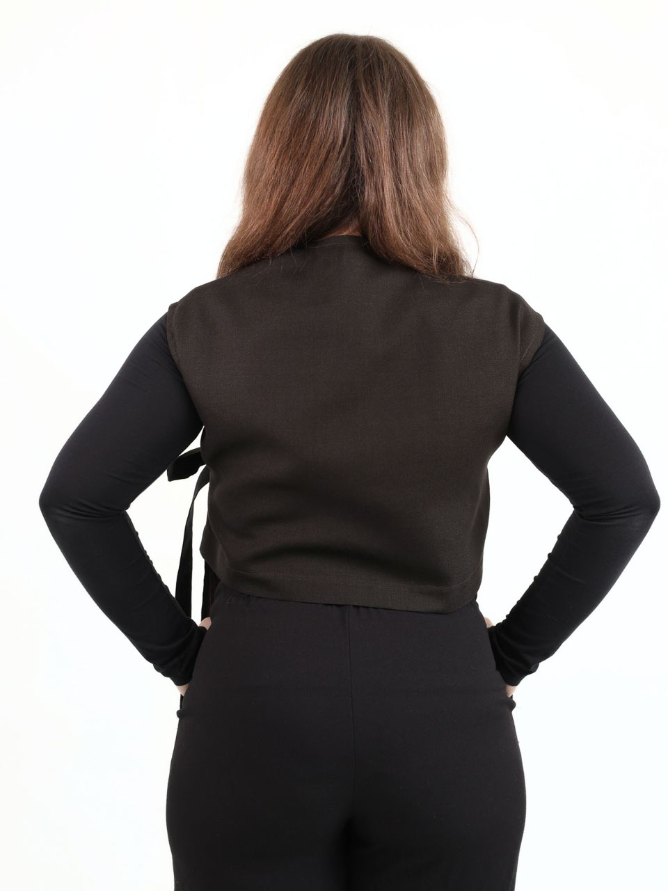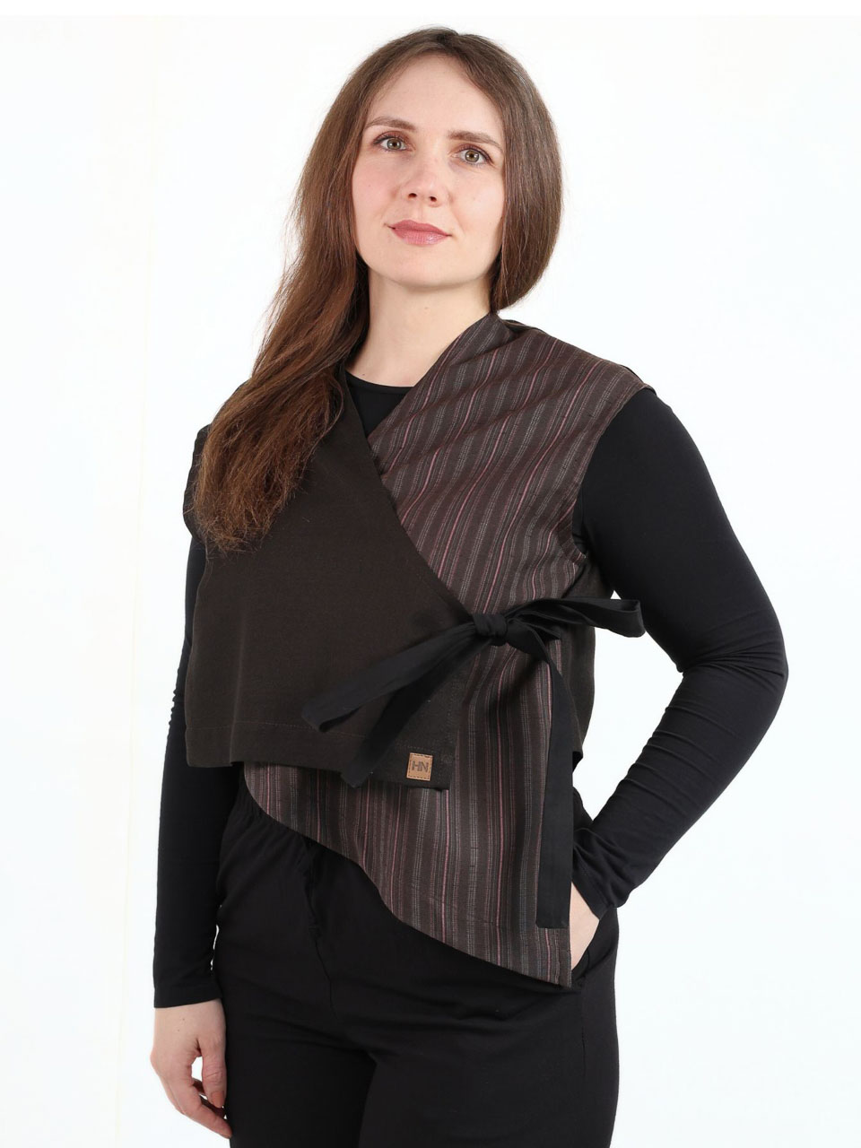 Ovaj zero waste praktičan i stilski prsluk izrađen je od reslova iz proizvodnje i nosiv je na više načina. Veže se u struku, čime se lako prilagođava obliku tijela i outfitu. Nosite ga: preko košulje za poslovni izgled, uz kratku ili dugu majicu za ležernu varijantu ili samostalno ljeti – kao efektan top. Raspon veličina: S-L
