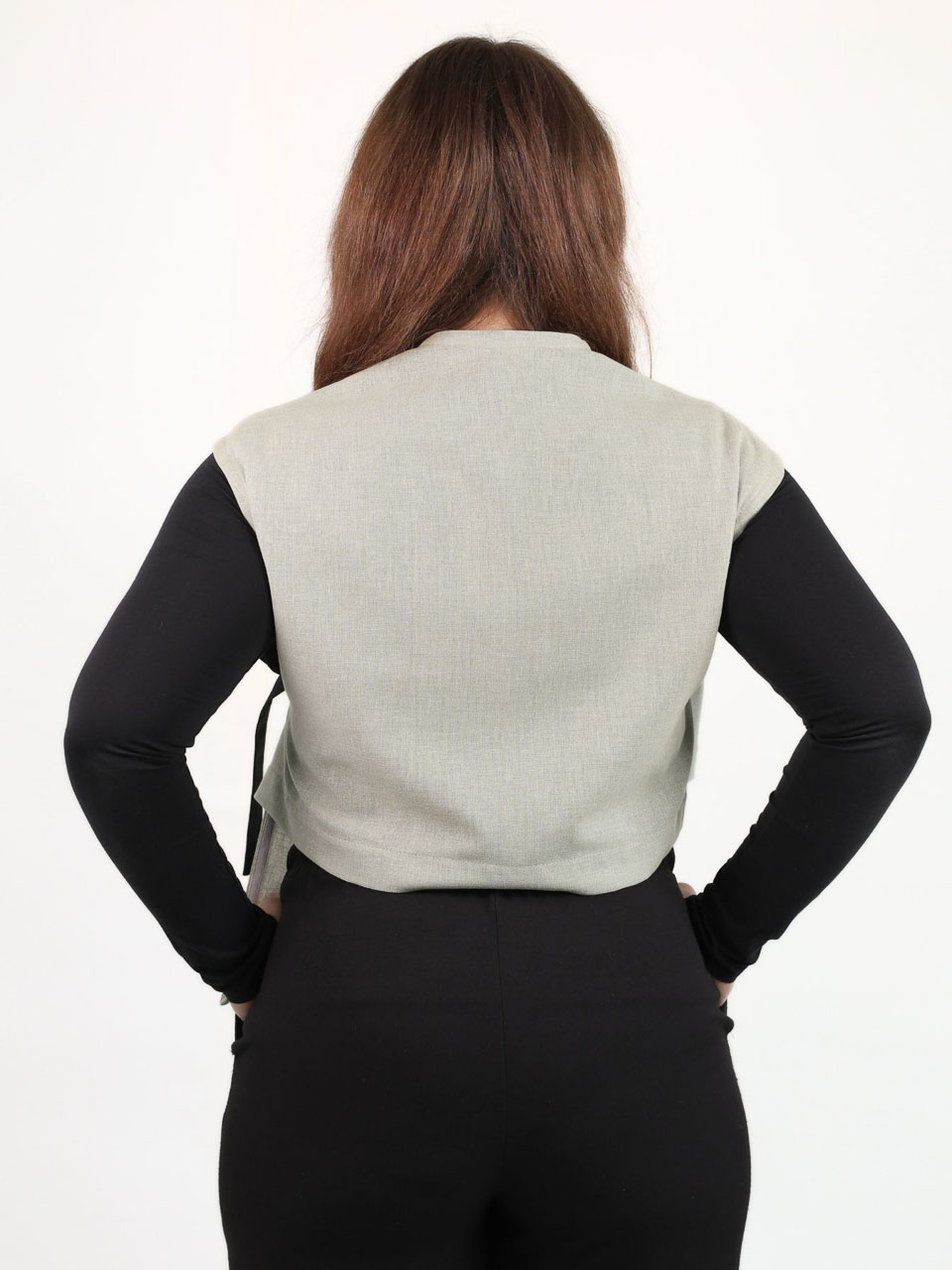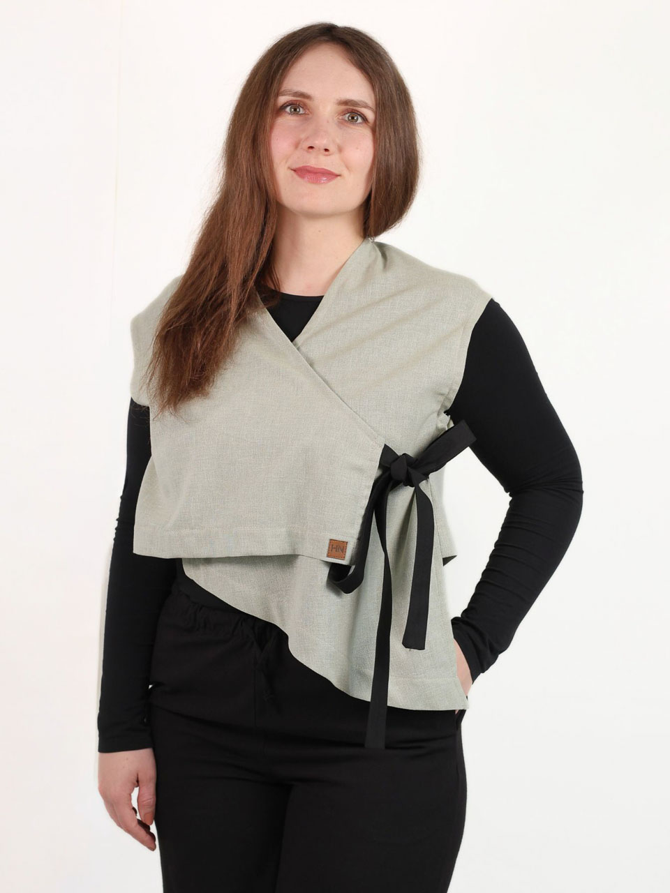 Ovaj zero waste praktičan i stilski prsluk izrađen je od reslova iz proizvodnje i nosiv je na više načina. Veže se u struku, čime se lako prilagođava obliku tijela i outfitu. Nosite ga: preko košulje za poslovni izgled, uz kratku ili dugu majicu za ležernu varijantu ili samostalno ljeti – kao efektan top. Raspon veličina: S-L