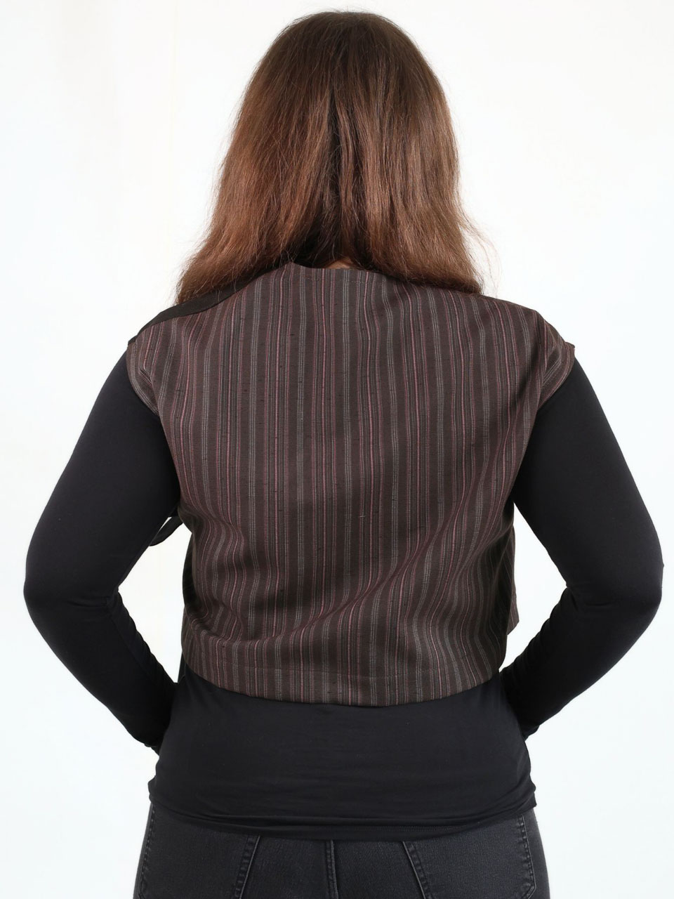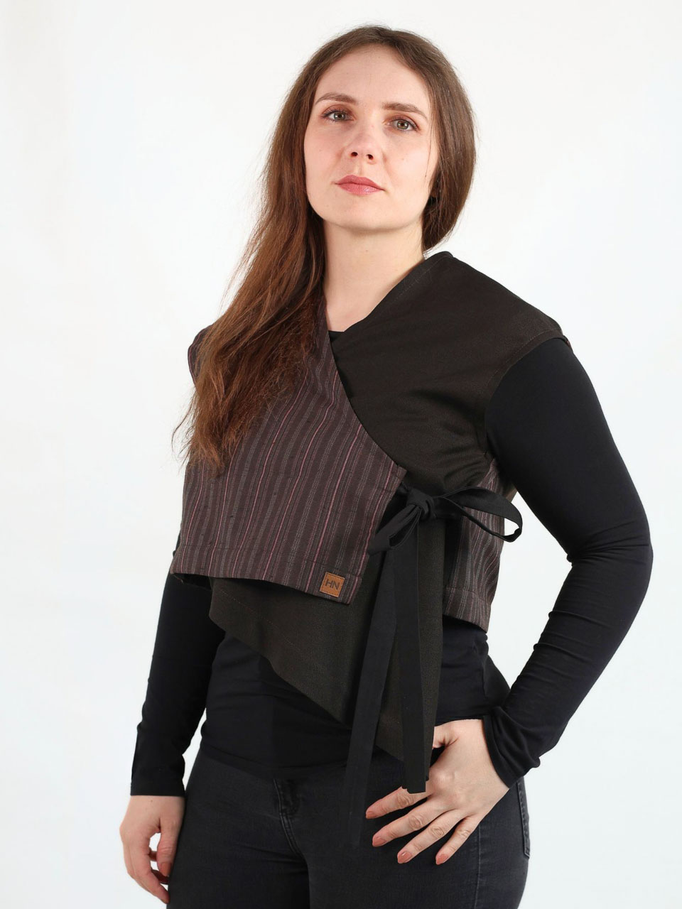 Ovaj zero waste praktičan i stilski prsluk izrađen je od reslova iz proizvodnje i nosiv je na više načina. Veže se u struku, čime se lako prilagođava obliku tijela i outfitu. Nosite ga: preko košulje za poslovni izgled, uz kratku ili dugu majicu za ležernu varijantu ili samostalno ljeti – kao efektan top. Raspon veličina: S-L