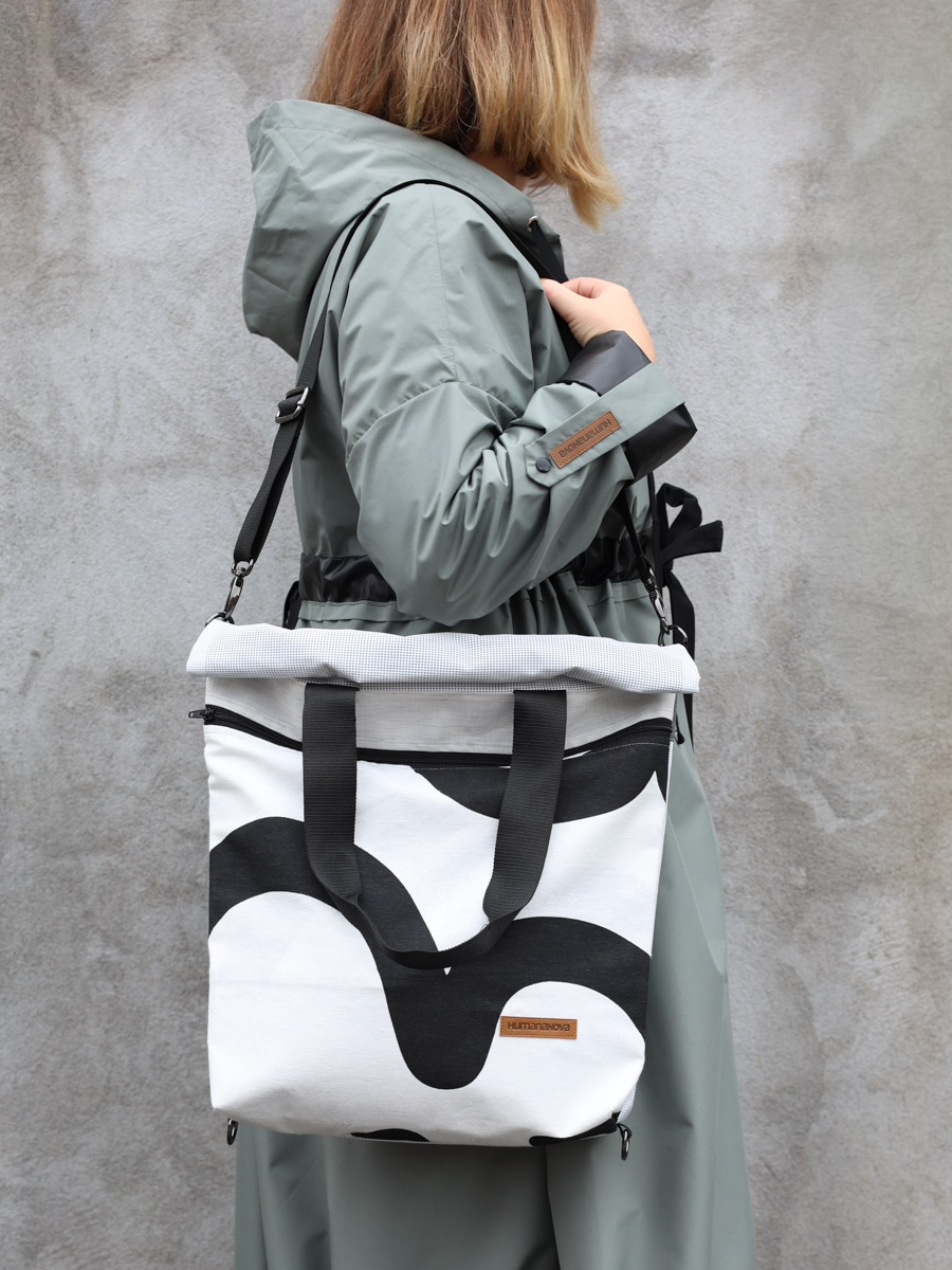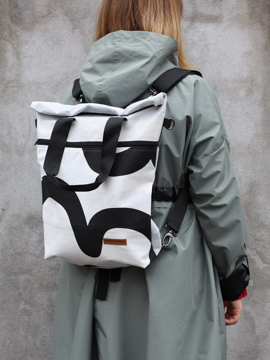 ECOVENTURE je višenamjenski ruksak izrađen u Humani Novoj od prenamijenjenih i čvrstih materijala. Zahvaljujući metalnim drukerima, gornji dio se može zarolati i zakopčati, mijenjajući oblik i volumen. Podesive naramenice, praktični džepovi (uključujući skriveni leđni i unutarnji džep s kopčom za ključeve) čine ga savršenim za organizaciju u pokretu. Kada se skinu naramenice, ECOVENTURE postaje torba – nosiva u ruci, na ramenu ili preko tijela. Svaki primjerak je jedinstven.